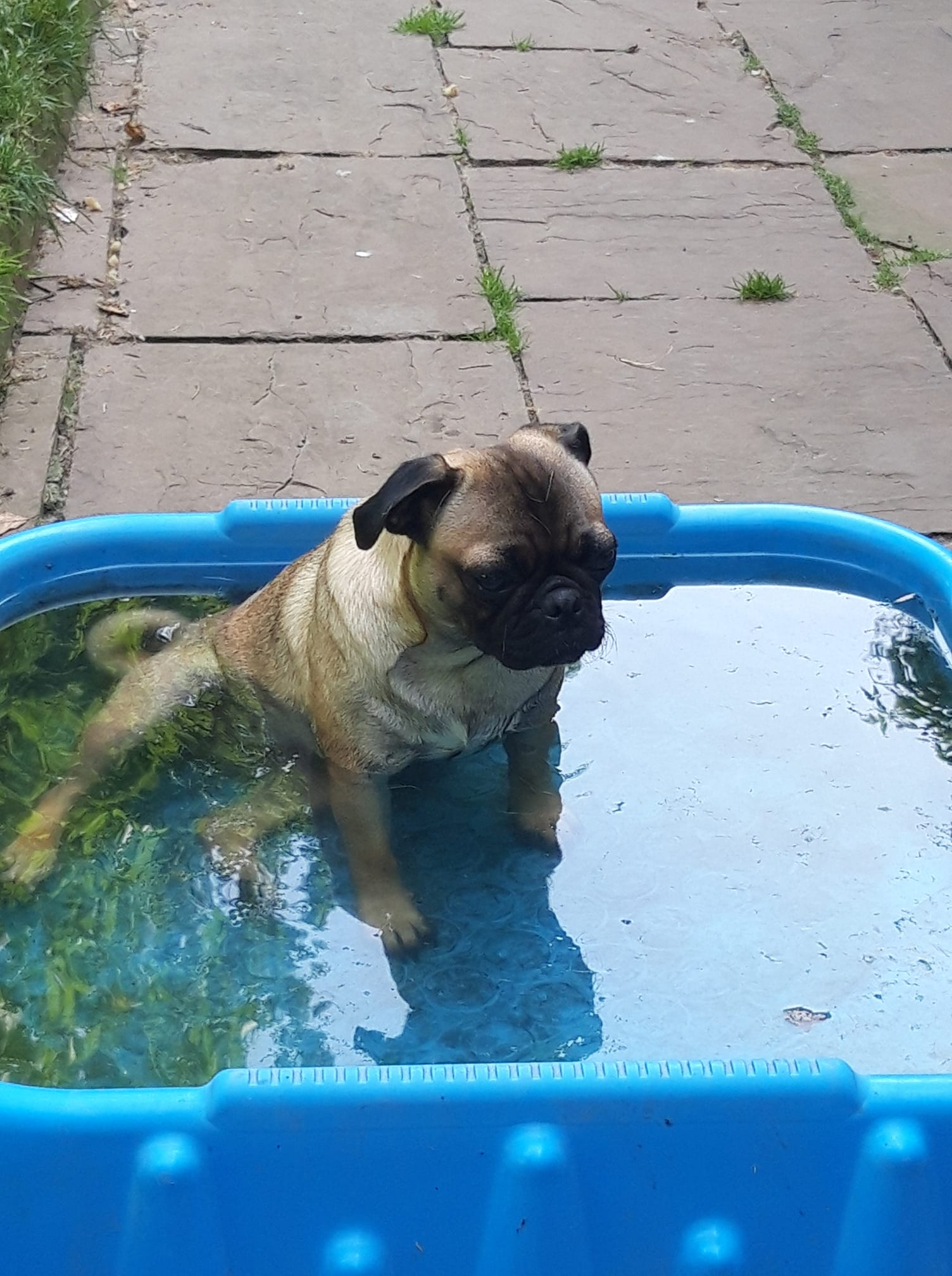 Im Sommer geht Tilda sehr gerne in das Wasser und plantscht wir haben extra einen Hunde Pool aufgestellt.