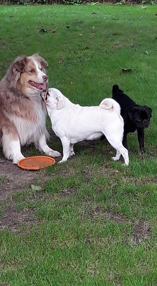 unser Mini Aussie Skip ist der beste Freund der Möpse , er wurde von uns aus den USA importiert und hat viele große Internationale Shows gewonnen sein größter Erfolg wahr die MASCA Show in Paris dort hat er alles gewonnen in seiner Klasse :-)