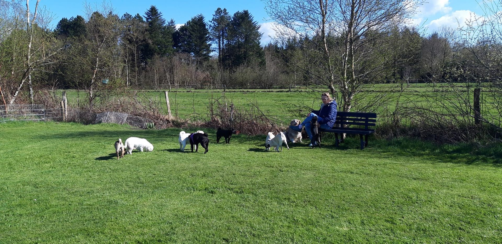 Unsere Hundewiese hier toben sich alle mehrfach am Tag aus unten die Bank steht nun an unserem Wald dort verweilen wir schon mal gerne und schauen den Hunden beim spielen zu.