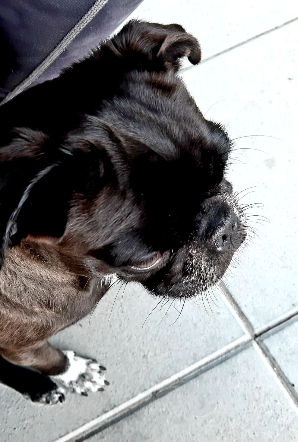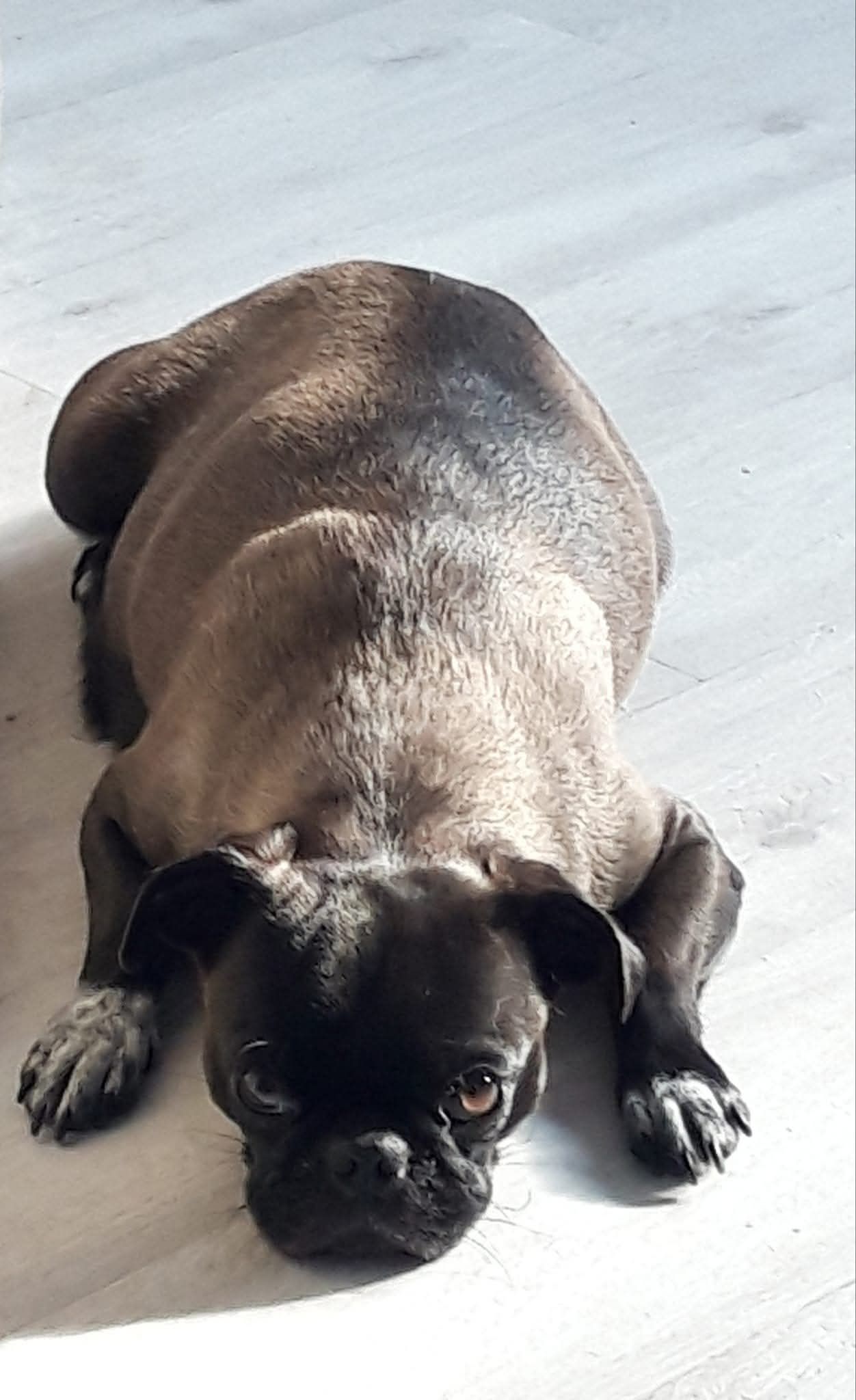 Unsere Mops Hündin Gitte ist eine eigene Nachzucht aus Hazel und einem Retro Mops Rüden. Ihre Babys haben noch einen geringen Fremdblutanteil von 2,6 % (Parson Russel Terrier ).